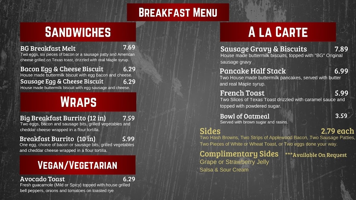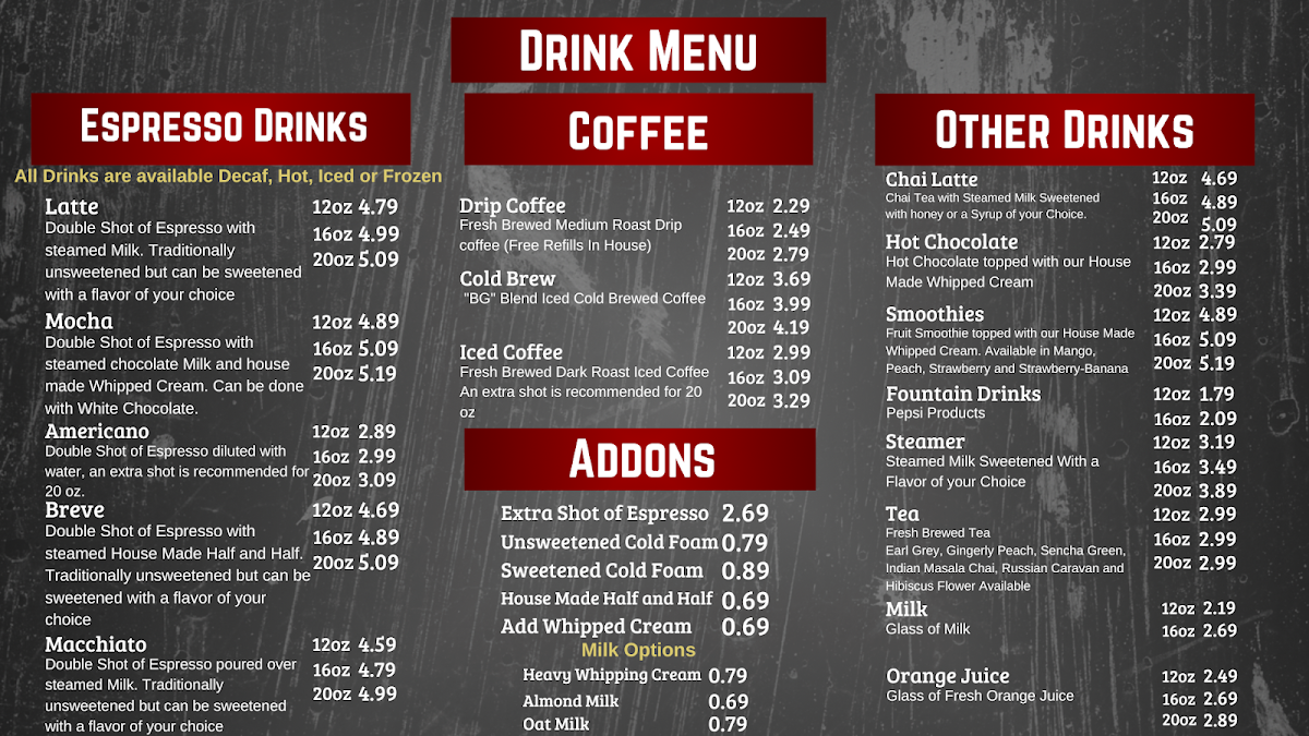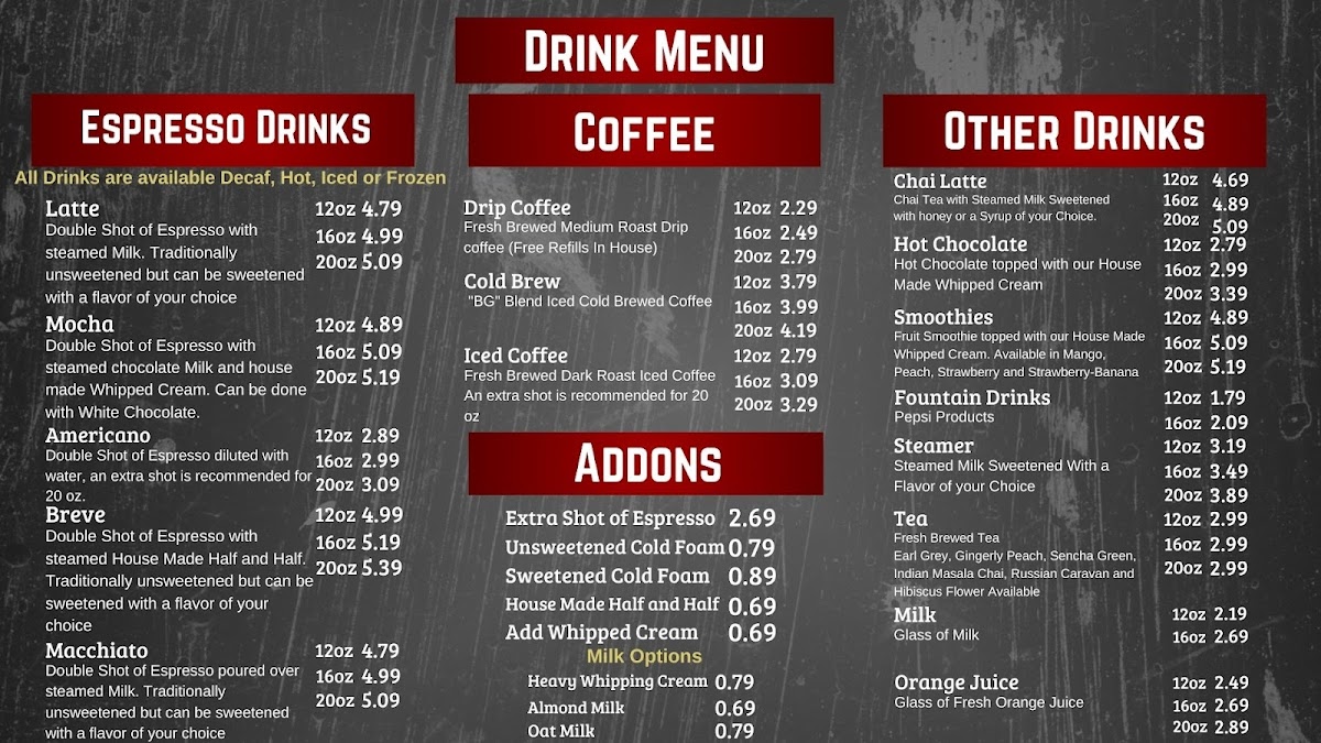 Broken Grounds Coffee Company offers a straightforward, comforting menu that suits both quick visits and relaxed mornings. The selection revolves around classic café fare paired with well-crafted coffee and casual bites that feel just right whether you’re stopping in to start your day or enjoying a midday break.